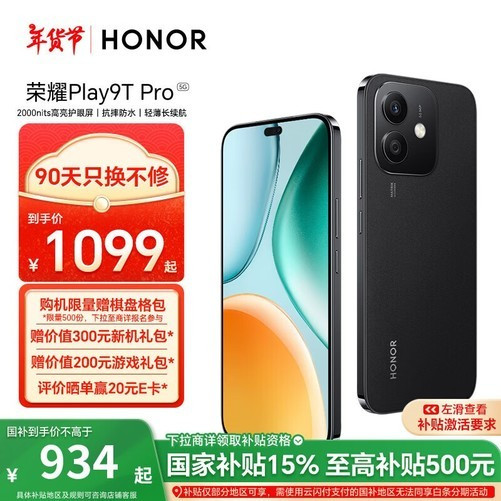 荣耀HONORPlay9TPro5G手机,是一款性价比较高的智能手机。拥有8GB的运行内存和256GB的存储空间,能够流畅运行各种大型游戏和应用程序。同时搭载了先进的处理器技术,让手机在运行过程中更加流畅、快速。此外,该款手机还采用了最新的屏幕技术,使显示效果更加清晰、细腻。目前京东此款活动售价只需1093元,下单领取满200元减20元优惠券,参与江苏国补立减15%,plus立减5.46元优惠活动,实付低至907.41元,喜欢的朋友千万不要错过这次促销机会!